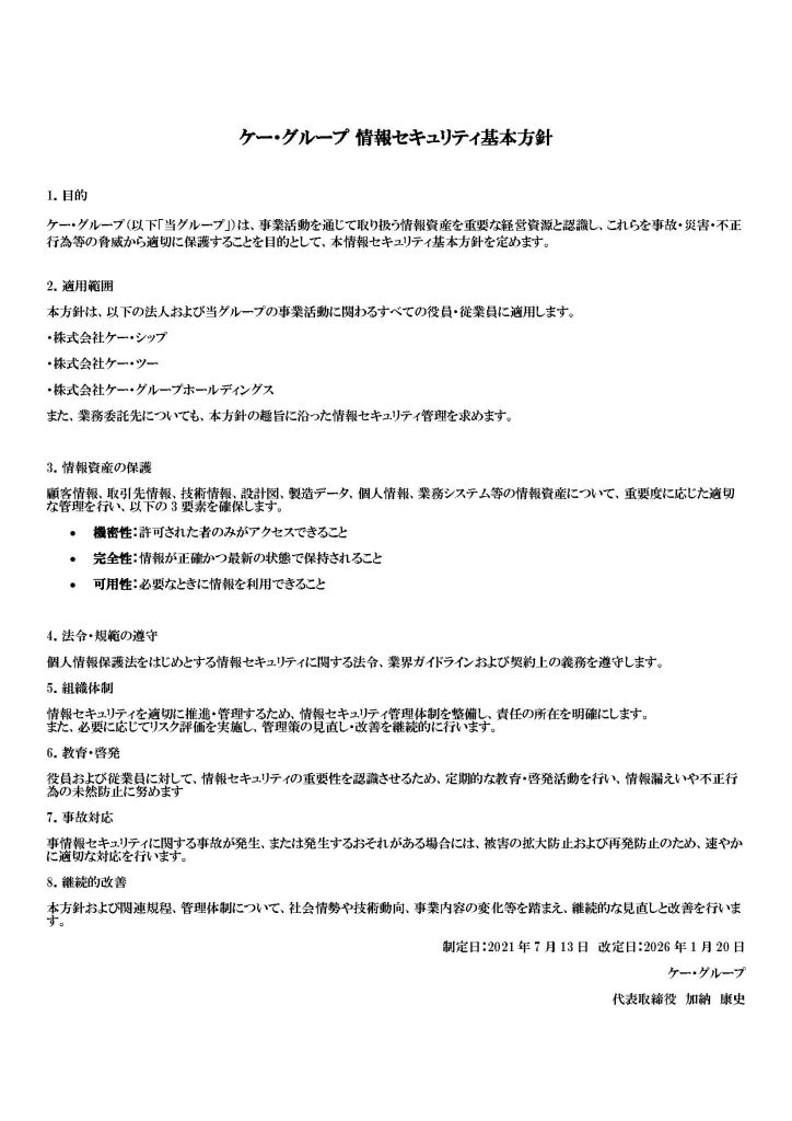 リスクマネジメント 機密管理と情報セキュリティ 機密情報の適切な管理が事業活動の重要な要素の一つと考え、当社グループ共通の方針である「情報セキュリティ基本方針」を制定し、グループ一体となり組織的かつ継続的に情報セキュリティの強化に取り組んでいます。 さらに、教育も重要と考え、標的型メール訓練などを通した、社員のセキュリティ意識向上活動も実施しています。